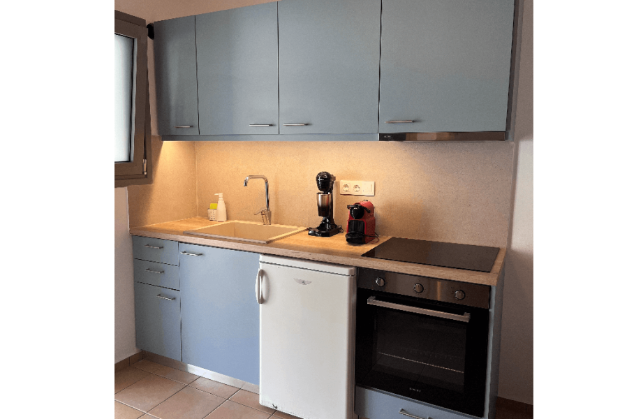 - Πλήρως εξοπλισμένη κουζίνα (Μαγειρικά σκεύη, καφετιέρες Espresso, γαλλικού).